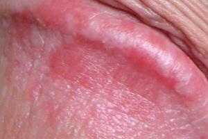 - small, eroded, itchy spots/plaques may be present with a white cheese-like matter, which can be rubbed off easily